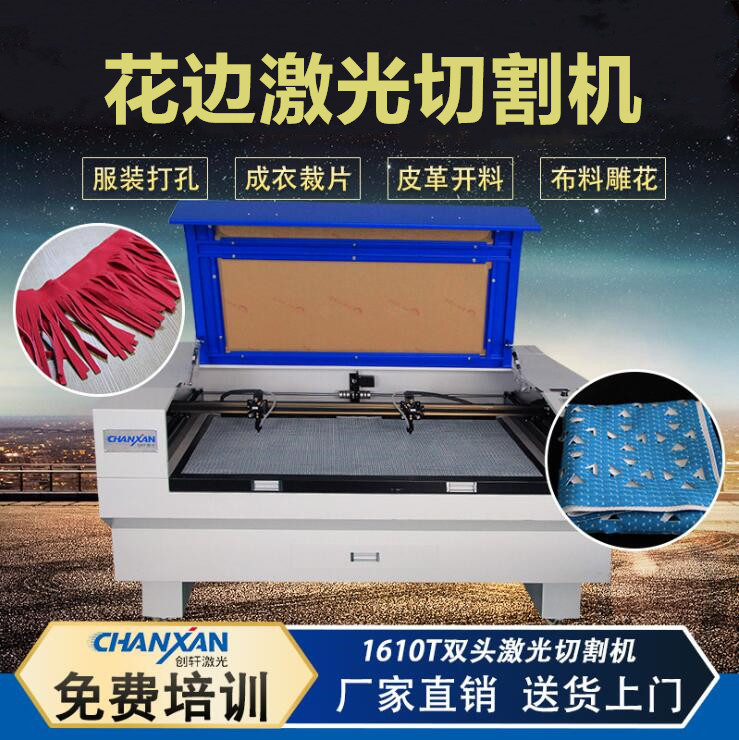 花邊激光切割機,適用于大幅面布料激光切割、雙頭對稱激光切割、鏡像切割圍巾、布鞋、手套等對稱圖形的激光切割工藝。